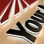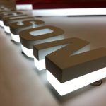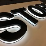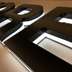 Zwarte, driedimensionale letters met een witte verlichting aan de onderkant, geplaatst op een lichte achtergrond.